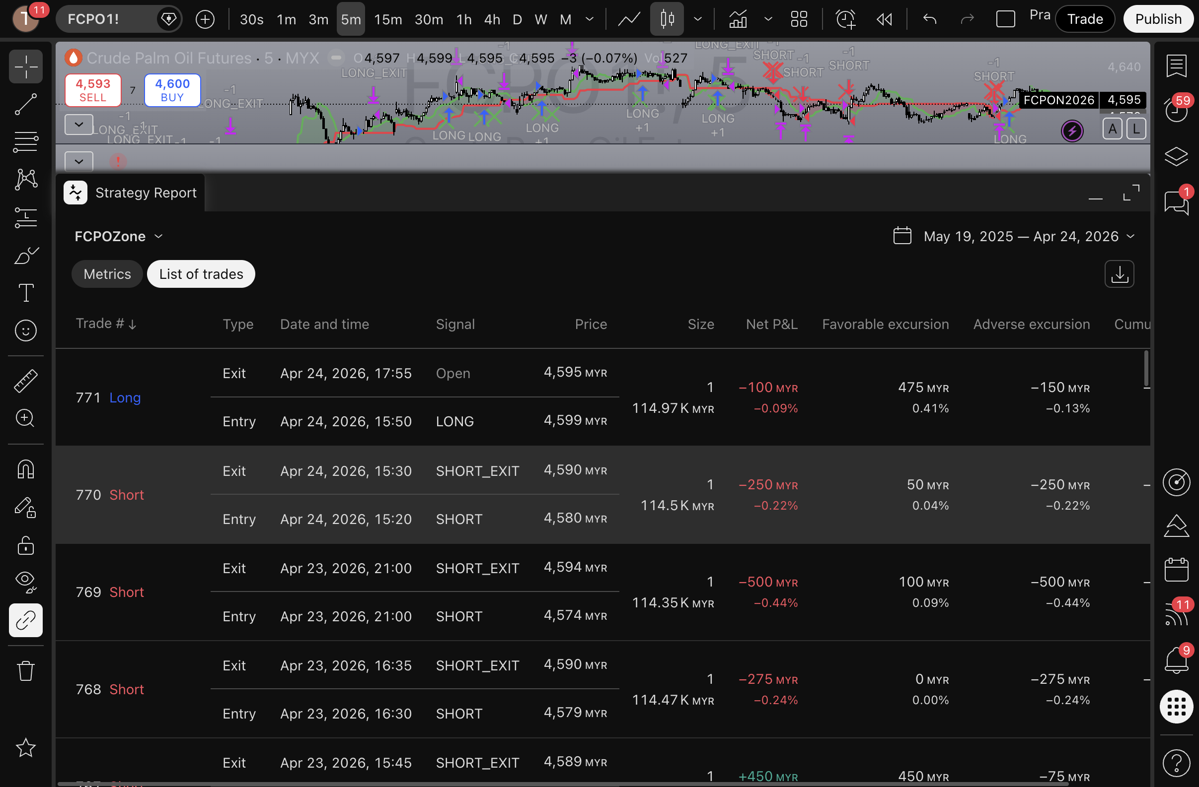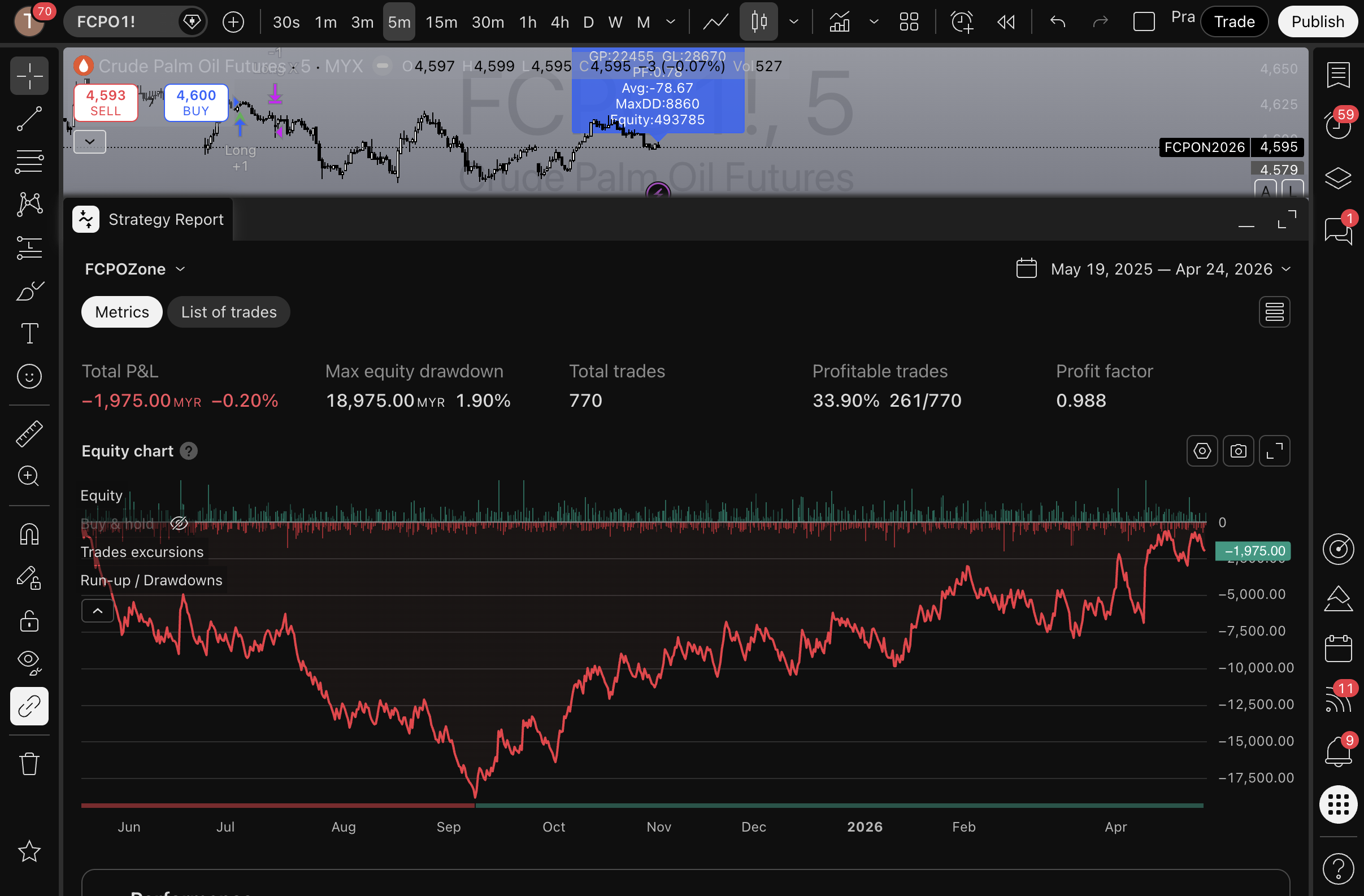 This strategy: Wave-5 TV Strategy Tester capture (770 trades, 1,038 trading days). 33.9% WR with PF 0.96 — very close to break-even but slightly negative net (-1,875 MYR). Trades fire often enough that even small per-trade EV improvements would tip it positive; needs filtering on regime / volume.