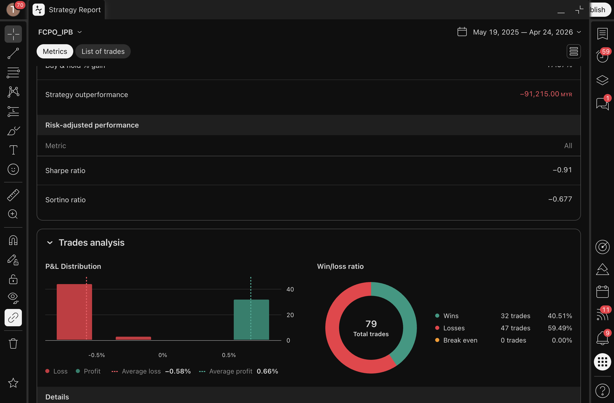 This strategy has not been validated against TradingView multi-year history yet — RM/day, trades/day, and monthly projection are only computed from authoritative TV stats. The 1-month sweep below is in-sample only and should not be used as a profit forecast.