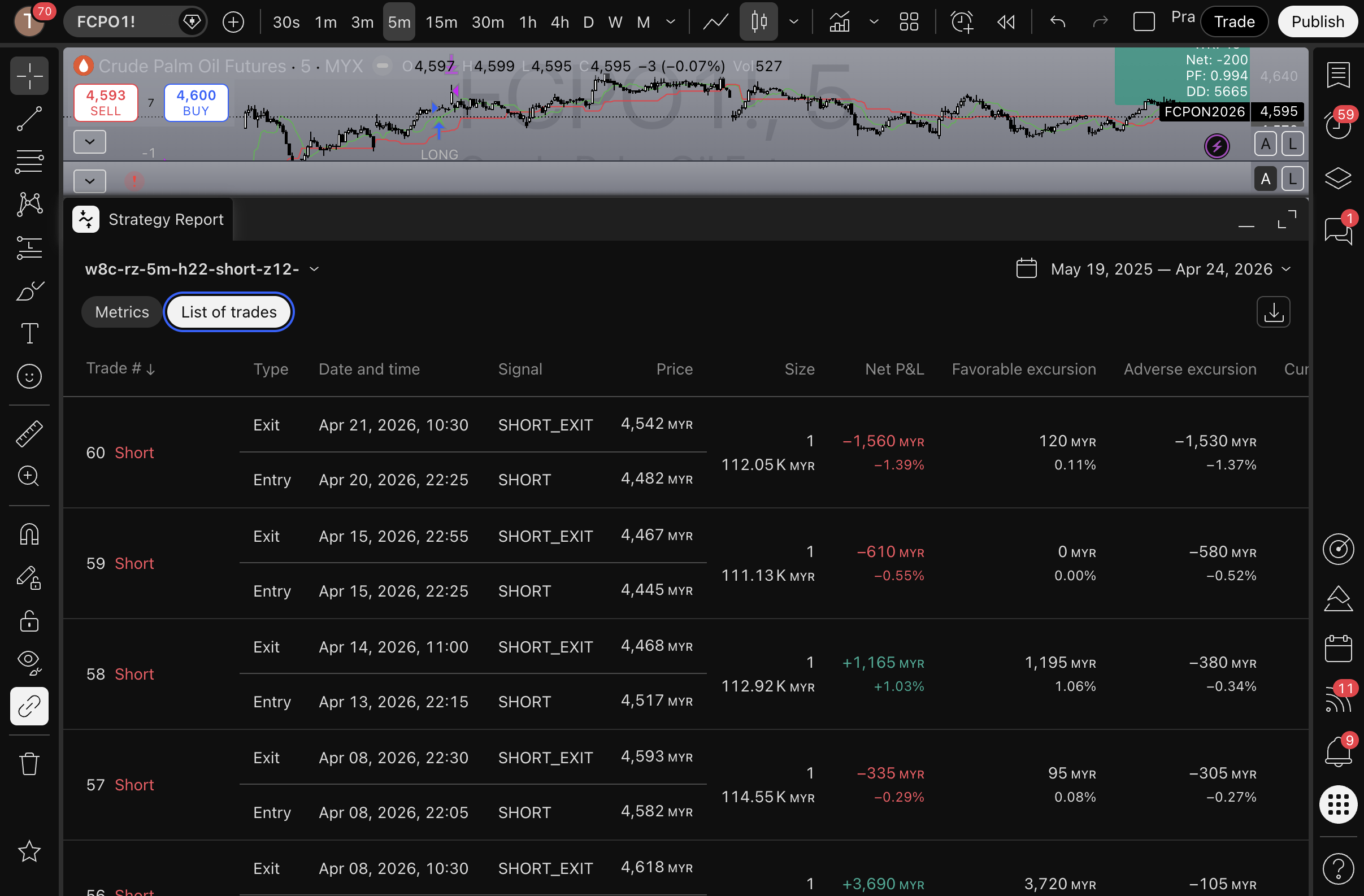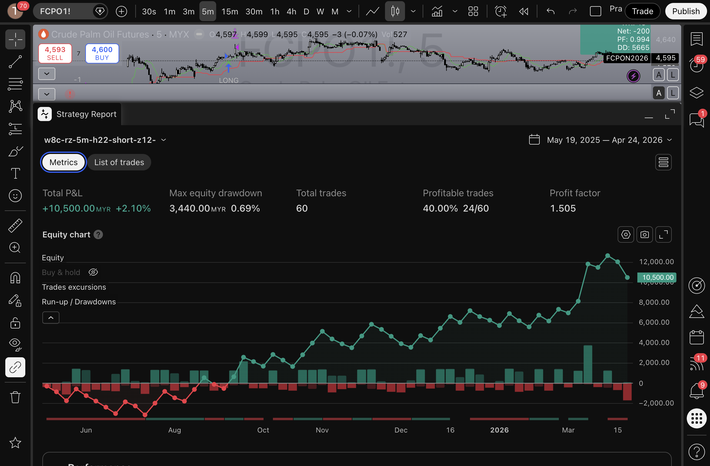 5m short-only rejection-zone setup during `2200-2259`. It reproduced in the live TV panel at RM 10,500 net, PF 1.505, 60 trades, and 40.0% win rate. It remains a research candidate because it has not passed date-split, robustness, or forward paper testing.
